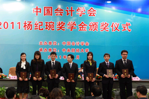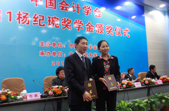 11月20日上午,2011年中国会计学会杨纪琬奖学金颁奖仪式在中央财经大学隆重举行。财政部副部长、中国注册会计师协会会长李勇,教育部副部长李卫红,中国会计学会会长、原中纪委驻财政部纪检组长金莲淑,教育部原部长助理杨周复,财政部科研所教授王世定,中央财经大学校长王广谦教授出席本次颁奖仪式并在主席台就坐。颁奖仪式由财政部会计司司长杨敏主持。