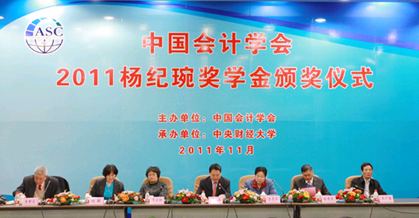 中国会计学会金莲淑会长宣读了本次杨纪琬奖学金评选说明和获奖者名单。自2011年起,杨纪琬奖学金移交中国会计学会,评选工作由中国会计学会组织实施。2011年杨纪琬奖学金评选出优秀会计学术专著获奖者2人,优秀学位论文获奖者7人。其中,武汉大学副教授李青原的专著《制度环境、会计信息质量与资本配置》、财政部会计司副司长应唯和财政部财政科学研究所教授杨周南合著的《中国XBRL分类标准问题研究》,分别获得杨纪琬奖学金优秀会计学术专著奖。邓路、刘昌胜、吴艳琴、祝继高、张正勇5位博士和金韵韵、李欣忆2位硕士荣获“优秀学位论文奖”。